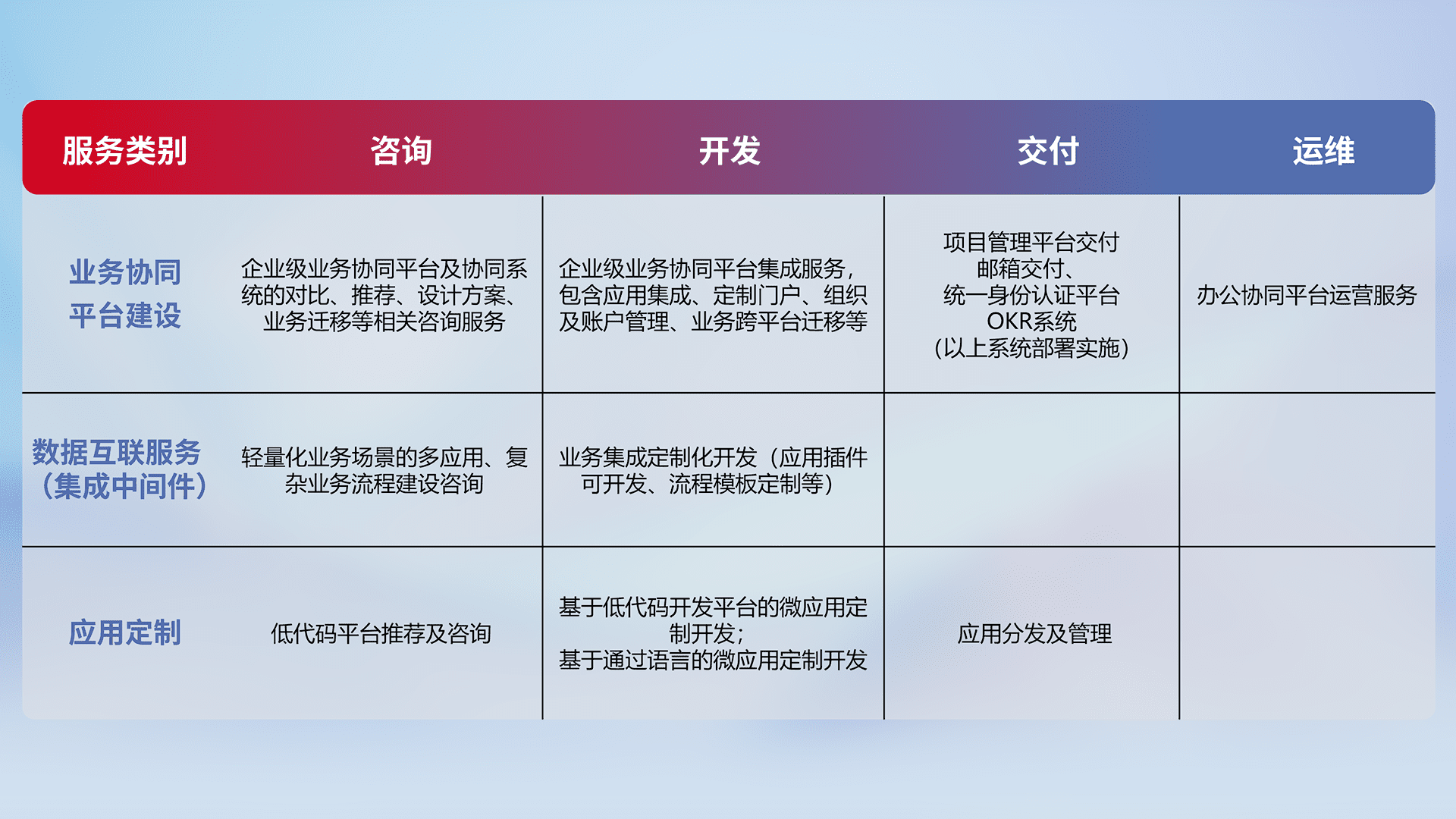 针对钉钉、、企微、、、IDaas等平台级产品提供产品的规划、、、、方案、、、、交付、、、定制化开发等服务,,实现如统一协同办公、、、、智能客户服务、、、混合会议管理、、智能数据查询、、、等业务场景,,,,实现数字化转型。。。。
